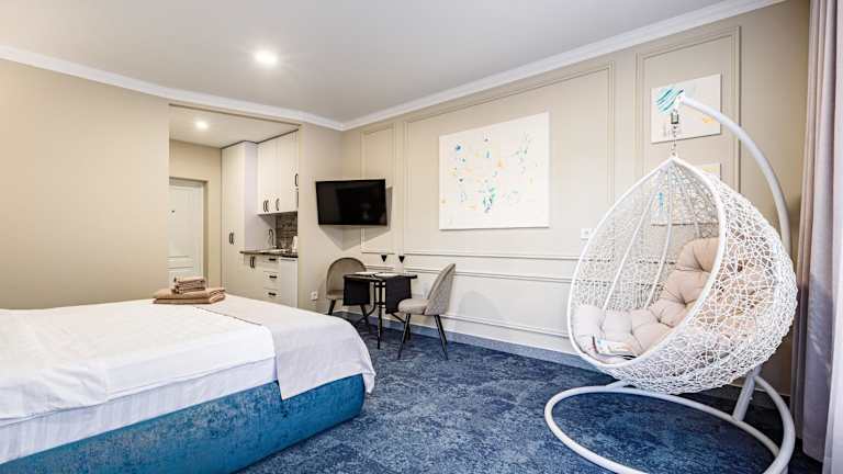 ApartReserve Avtorskiy Aparthotel bietet Unterkünfte mit kostenlosem WLAN und privatem Parkplatz. Jede Wohneinheit verfügt über ein eigenes Badezimmer mit Dusche, Klimaanlage, Flachbild-TV und Kühlschrank. In bestimmten Wohneinheiten sind Küchen mit Geschirrspüler, Ofen und Herdplatte vorhanden.