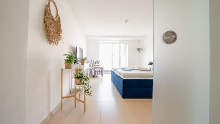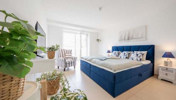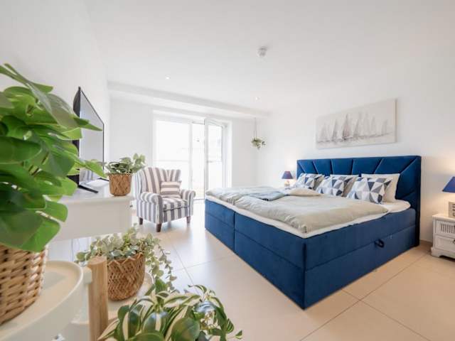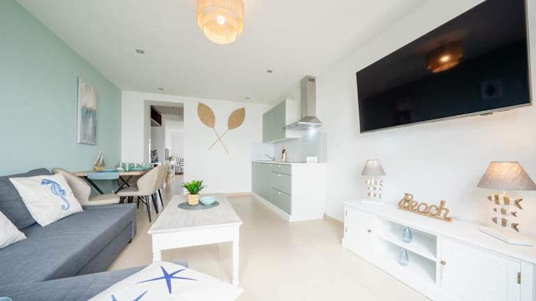 Die Ferienwohnung verfügt über ein Schlafzimmer, ein Wohnzimmer und eine Terrasse mit Meerblick. Zur Ausstattung gehören ein Flachbild-TV, eine gut ausgestattete Küche mit Kühlschrank und Geschirrspüler sowie ein Badezimmer mit Dusche.
