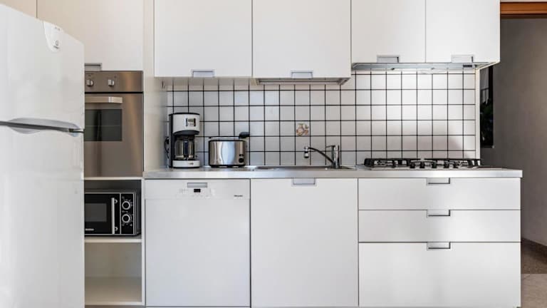 In jeder Wohneinheit gibt es eine voll ausgestattete Küche mit Esstisch, Kühlschrank, Mikrowelle, Herdplatte, Kaffeemaschine und Wasserkocher.