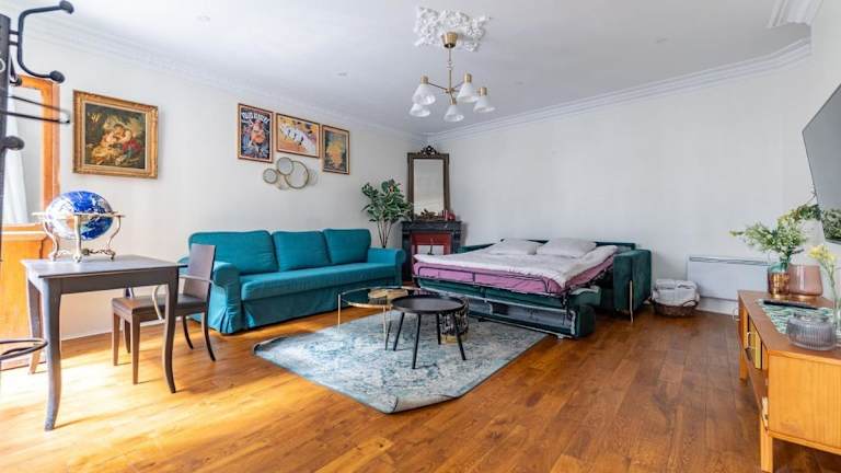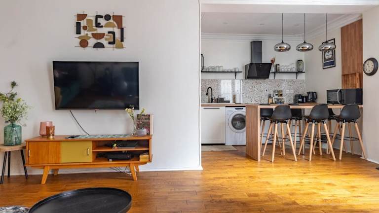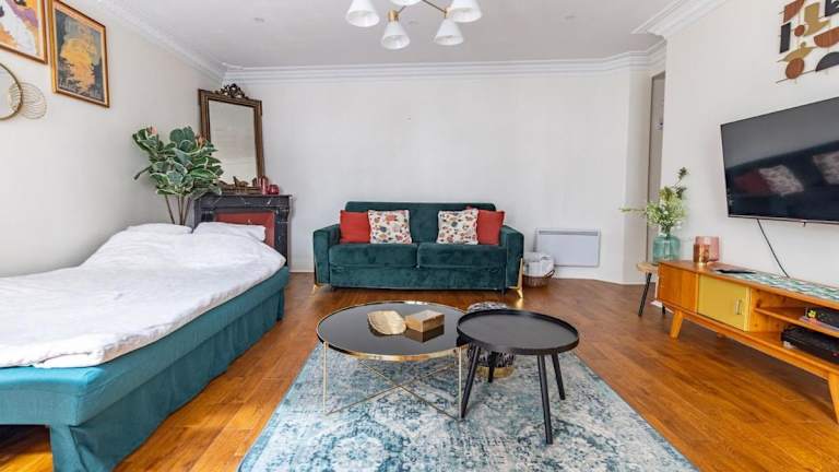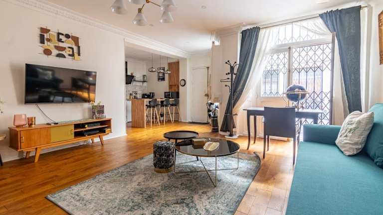 Das Appartement 2 étages Paris - Métro 9 Grands Boulevards - Folies Bergères ist eine Ferienwohnung im Erdgeschoss, die komfortabel gestaltet ist und für längere Aufenthalte geeignet ist. Die Unterkunft bietet eine praktische Anbindung an die öffentlichen Verkehrsmittel und liegt in einem kulturell reichen Viertel von Paris.