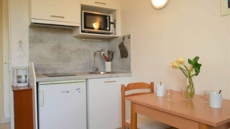 Die Ferienwohnung verfügt über 1 Schlafzimmer sowie ein Wohnzimmer mit einem TV. Eine voll ausgestattete Küchenzeile mit Kühlschrank ist ebenfalls vorhanden. Das Badezimmer ist Teil des Wohnraums, der insgesamt für 3 Personen ausgelegt ist.