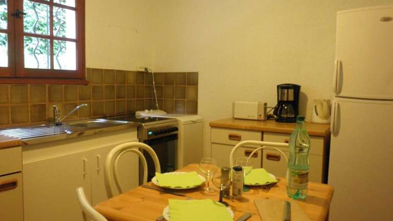 Die Unterkunft ist mit einer voll ausgestatteten Küche ausgestattet, die einen Kühlschrank, einen Ofen und eine Herdplatte umfasst. Ein Essbereich ist ebenfalls vorhanden.