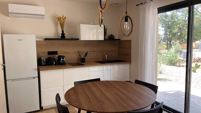 Die Unterkunft verfügt über eine Küche mit einem Kühlschrank sowie einen Essbereich. Handtücher und Bettwäsche sind ebenfalls vorhanden.