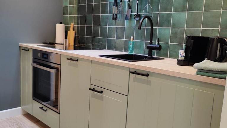 Frühstück kann im Zimmer serviert werden. Es gibt eine voll ausgestattete Küche in jeder Wohneinheit, die mit einem Kühlschrank, Geschirrspüler, Ofen, Kaffeemaschine und Wasserkocher ausgestattet ist.