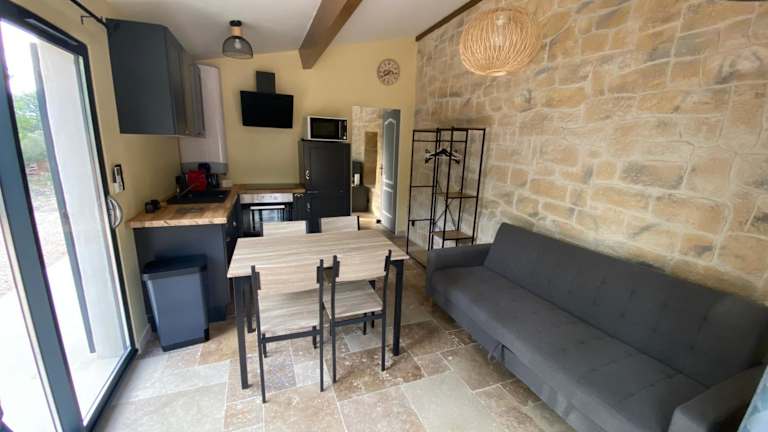 Das Appartement de charme avec jaccusi bietet ein gemütliches und gut ausgestattetes Ferienhaus mit einem Schlafzimmer. Die Unterkunft verfügt über eine Terrasse, auf der Sie den Blick auf den Garten genießen können. In der Küche finden Sie einen Kühlschrank und eine Kaffeemaschine, um Ihre eigenen Mahlzeiten zuzubereiten. Das Wohnzimmer ist ein komfortabler Raum, in dem Sie sich entspannen können. Handtücher und Bettwäsche können gegen Aufpreis zur Verfügung gestellt werden.