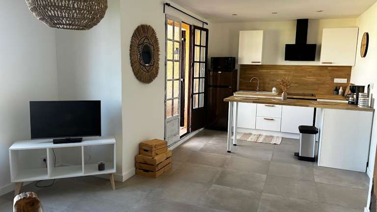 Appartement de vacances au calme absolu, vue mer bietet Übernachtungsmöglichkeiten mit Meerblick, einem Balkon und einer Terrasse. Die Unterkunft ist klimatisiert und umfasst ein Schlafzimmer, ein Wohnzimmer sowie eine voll ausgestattete Küche.