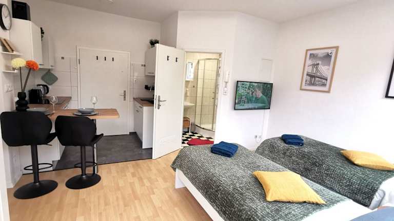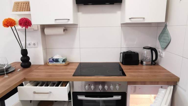 Die Ferienwohnung umfasst 1 Schlafzimmer, eine voll ausgestattete Küche mit Kühlschrank und Ofen sowie ein Badezimmer mit Dusche, Haartrockner und Waschmaschine. Handtücher und Bettwäsche werden bereitgestellt.