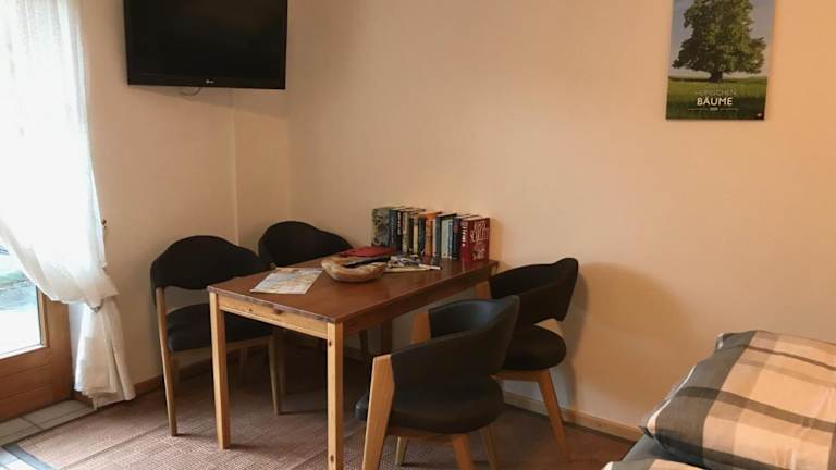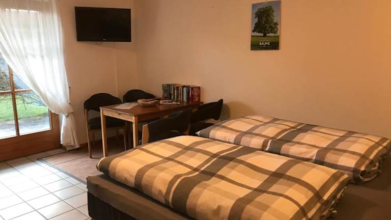 Die Ferienwohnung beinhaltet ein Schlafzimmer, ein Badezimmer, Bettwäsche, Handtücher sowie einen Flachbild-TV. Weiterhin steht ein Essbereich und eine voll ausgestattete Küchenzeile zur Verfügung. Die Terrasse bietet einen Blick auf den Garten.