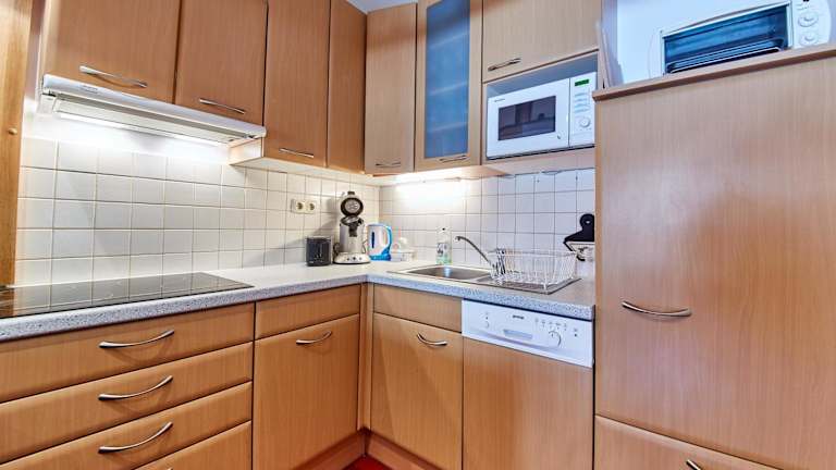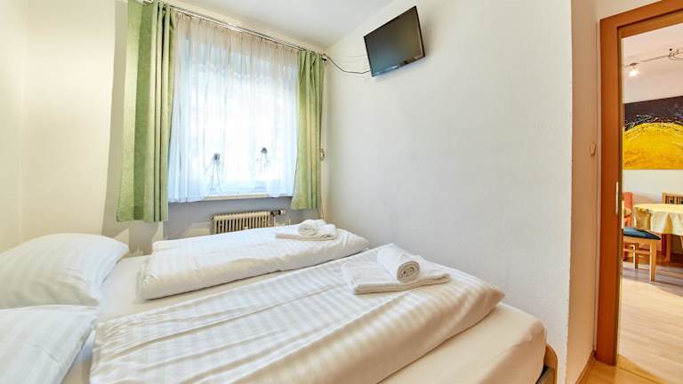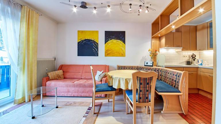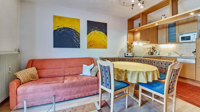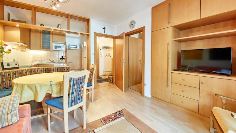 Die Ferienwohnung verfügt über ein Schlafzimmer, ein Wohnzimmer, einen Flachbild-TV sowie eine gut ausgestattete Küche mit Kühlschrank und Geschirrspüler. Ein Badezimmer mit Dusche ist ebenfalls vorhanden. Ein Balkon mit Bergblick bietet zusätzlichen Komfort. Handtücher und Bettwäsche werden bereitgestellt.