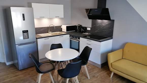 Das Appartement moderne entièrement rénové verfügt über zwei gemütliche Schlafzimmer, in denen Sie sich nach einem ereignisreichen Tag ausruhen können. Das Apartment ist modern und komplett renoviert, bietet einen Flachbild-TV und eine gut ausgestattete Küche mit einem Kühlschrank und einem Backofen. Sie finden auch eine Waschmaschine, um Ihre Wäsche zu erledigen, und ein Badezimmer mit einer Dusche. Handtücher und Bettwäsche werden gestellt, um Ihnen einen angenehmen Aufenthalt zu ermöglichen.