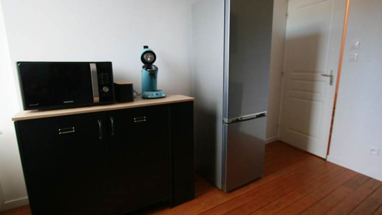 Die Ferienwohnung ist mit einer gut ausgestatteten Küche ausgestattet, die einen Kühlschrank und einen Geschirrspüler beinhaltet.