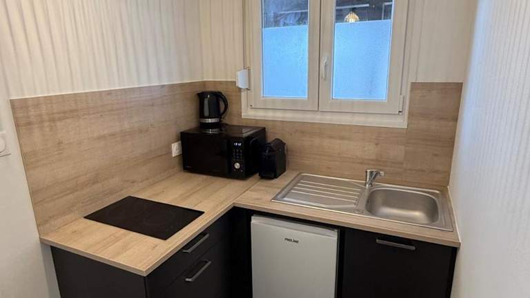 Die Unterkunft verfügt über eine voll ausgestattete Küche, in der Gäste ihre Mahlzeiten zubereiten können. Zudem gibt es ein Café vor Ort, das zusätzliche Verpflegungsmöglichkeiten bietet.