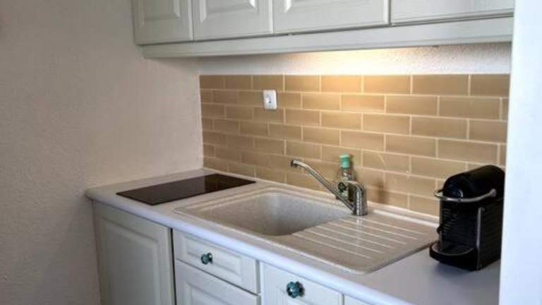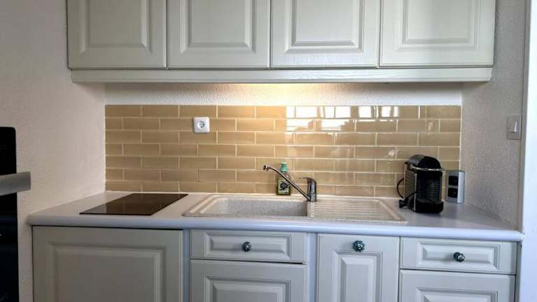 Die Ferienwohnung ist mit einer voll ausgestatteten Küche versehen, die über einen Kühlschrank, einen Ofen, eine Mikrowelle sowie eine Kaffeemaschine und einen Wasserkocher verfügt.