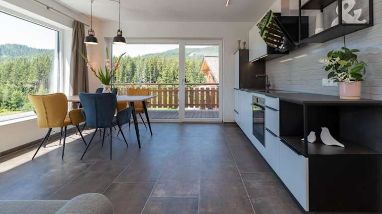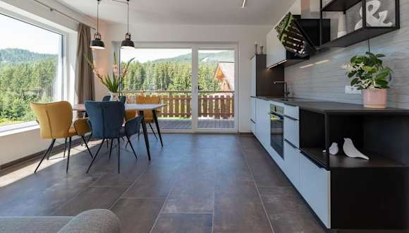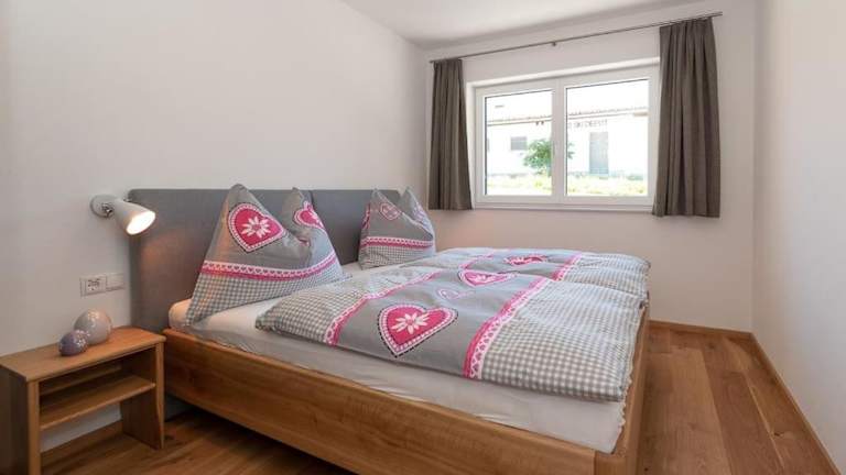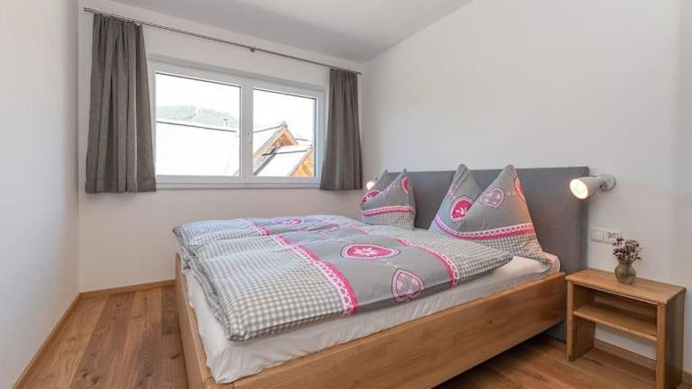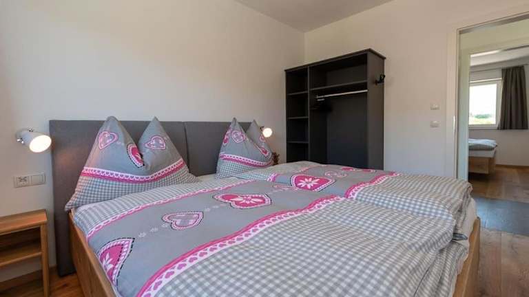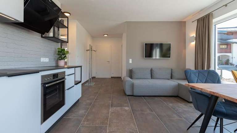 Die Ferienwohnung umfasst zwei Schlafzimmer und ein Wohnzimmer sowie einen Balkon mit Blick auf die Berge. Zur Ausstattung gehören ein Flachbild-TV, eine gut ausgestattete Küche mit Kühlschrank und Geschirrspüler sowie ein Badezimmer mit Dusche. Handtücher und Bettwäsche werden bereitgestellt.