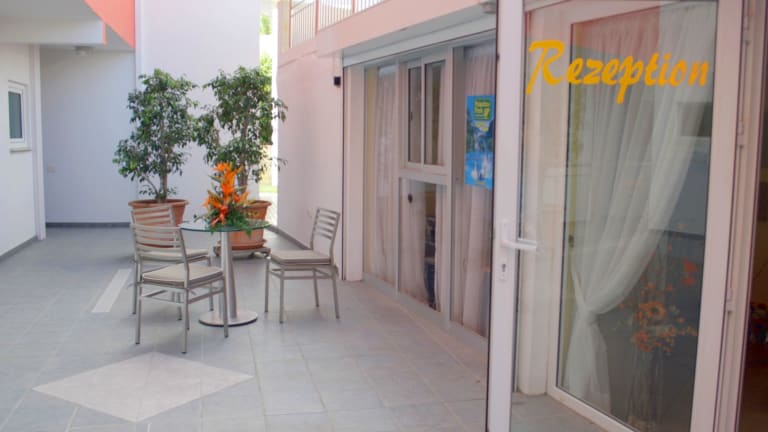 Die Apartements haben ein separates Schlafzimmer mit 2 zusammenstehenden 2 Meter großen Betten, sehr guten Matratzen und eingezogene Wäsche. Der Wohnraum mit angrenzender offener Küche ist freundlich tapeziert und möbliert. Großer SAT-TV mit allen Programmen ist vorhanden. Die Küche hat komplette Ausstattung u.a. Microwelle, Toaster, Kaffeemaschine, Wasserkocher, 4 Sterne Kühlschrank mit Gefrierfach usw. Das Bad hat zur besseren Lüftung ein Fenster, Dusche. Dem Wohnraum zur Südseite vorgelagert ist Balkon /Terrasse. Alle Wohnungen mit Balkon haben Meersicht. Suite: Gegenüber den Apartements noch bessere Ausstattung unter anderem rießengroßer Balkon oder Terrasse. Zugang zum Balkon/Terrasse nicht nur vom Wohnraum sondern auch vom Schlafraum aus. Im Schlafraum fefindet sich ein 2. SAT-TV. Der Fernseher im Wohnraum hat eine Größe von 102 cm. Wlan gratis.