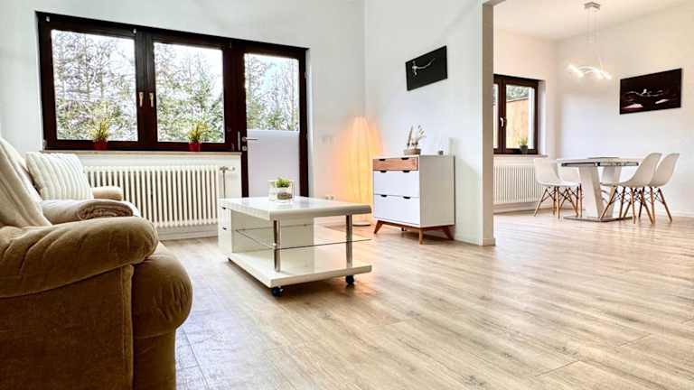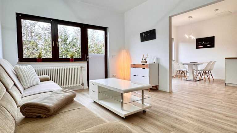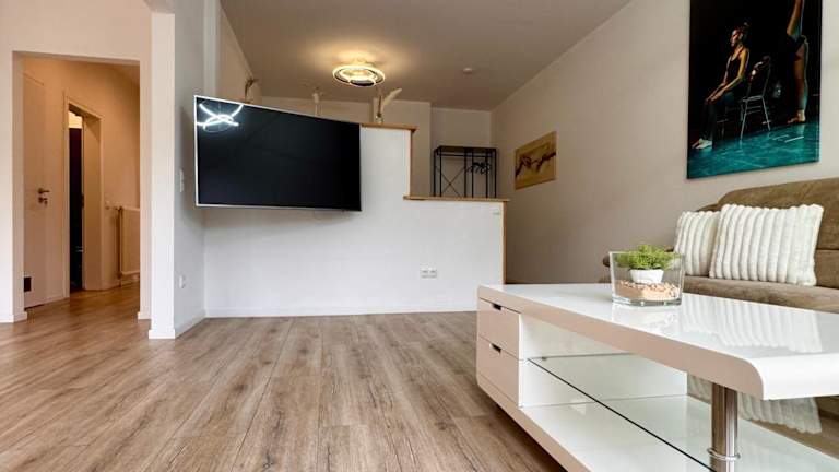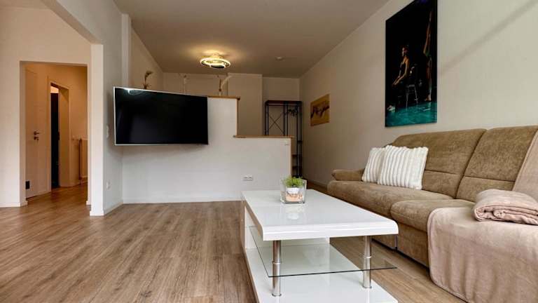 Die Ferienwohnung ist mit einem Satelliten Flachbild-TV und einem Wohnzimmer ausgestattet. Die Küche enthält einen Kühlschrank, Geschirrspüler, Ofen sowie eine Kaffeemaschine und einen Wasserkocher.