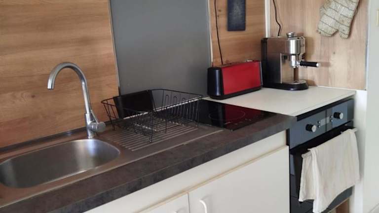 Die Ferienwohnung bietet eine voll ausgestattete Küche mit Kühlschrank und Kaffeemaschine. Eine Gemeinschaftsküche steht ebenfalls zur Verfügung.