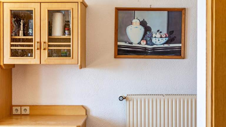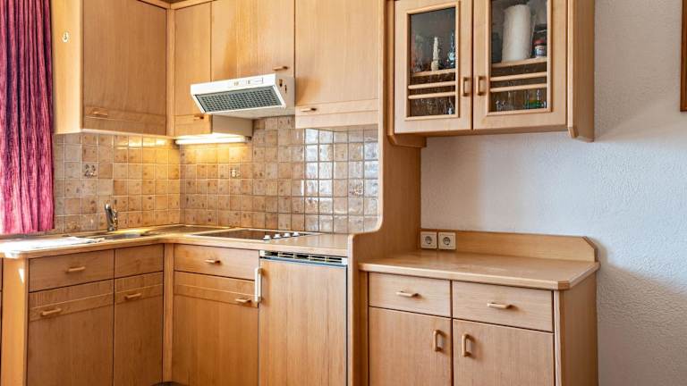 Die Ferienwohnung umfasst eine Küche, die mit einem Kühlschrank, einer Mikrowelle und einer Herdplatte ausgestattet ist, um den Gästen eine Selbstverpflegungsmöglichkeit zu bieten.