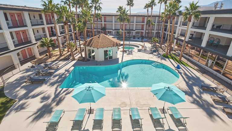 Das Aqua Soleil Hotel and Mineral Water Spa befindet sich in Desert Hot Springs, Kalifornien, etwa 16,1 km von der Innenstadt von Palm Springs und 53 km vom Joshua-Tree-Nationalpark entfernt. Der Flughafen Palm Springs International ist nach 20 Fahrminuten erreichbar.