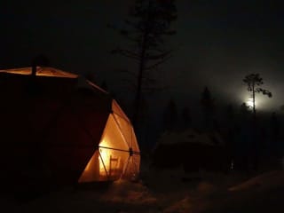Entweder im privaten Dome mit einer maximalen Belegung von 4 Personen. Es besteht aus einem Doppelbett und einer bequemen Schlafcouch. Oder aus dem Gemeinschaftsdome mit einer maximalen Belegung von 8, bestehen aus 2 Stockbetten und einer Schlafcouch. Die Domes werden mit einem Feuerofen beheizt, haben eine kleine Sitzecke und es werden warme Schlafsäcke bereitgestellt. Aus dem Bett heraus kann man durch die grossen Fenster die Nordlichter und die Sterne bewundern. Die Toilette ist ein traditionelles outhouse und befindet sich zwischen beiden Domes und wird gemeinsam genutzt.