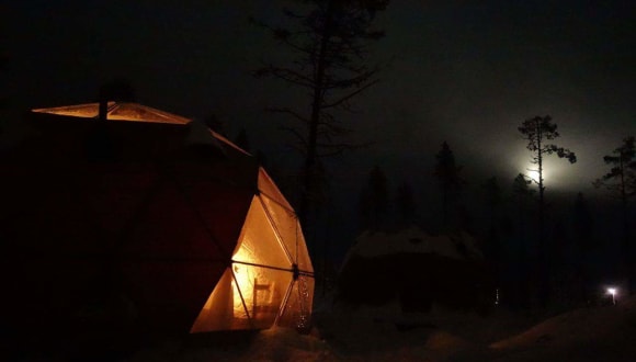Ein Dome Camp mitten in der Wildness, auf einer privaten Insel. Bestens geeignet fuer ein romantischen Zusammensein oder Kleingruppen bis max. 2 Personen. Die Nordlichter am Himmel, keine Lichtverschmutzung! Kein Wifi, keine Stromversorgung und kein laufendes Wasser stellen ein reines Naturerlebnis im schwedischen Lapland sicher. Finde heraus wie es ist, in der arktischen Wildness zu leben. Es ist immer ein guide vor Ort. Dieses hilft mit dem Feuer und den Mahlzeiten welche in einem Tipi zubereitet warden. Das Paket beeinhaltet neben einer Uebernachtung auch das Abendessen und Fruehstueck sowie die Sauna auf der Insel. Ab 3 Personen ist auch die Benutzung des hottubs inklusive. Ein Loch im Eis rundet das Wellness Angebot ab.