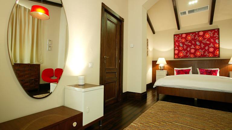 Die klimatisierten Zimmer und Suiten sind mit einem eigenen Balkon ausgestattet und bieten eine Kombination aus Vintage-Möbeln aus Massivholz und modernen Badezimmern.