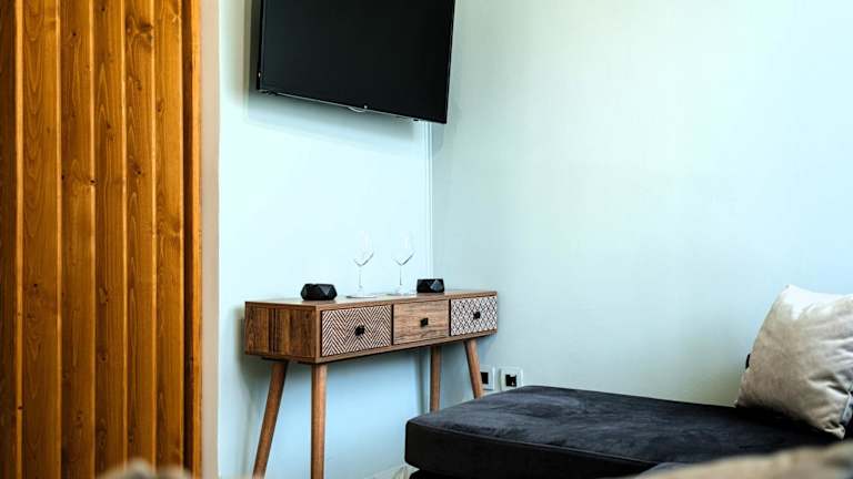 Das Ferienhaus verfügt über eine Klimaanlage und besteht aus einem Schlafzimmer, einem Wohnzimmer sowie einer voll ausgestatteten Küche, die mit einem Kühlschrank und einer Kaffeemaschine ausgestattet ist. Es bietet zudem ein Badezimmer mit Dusche und kostenlosen Pflegeprodukten. Handtücher und Bettwäsche werden bereitgestellt und die Zimmer sind schallisoliert. WLAN steht kostenlos zur Verfügung.