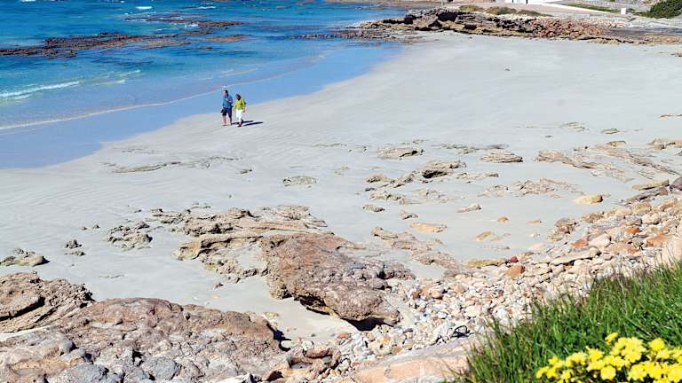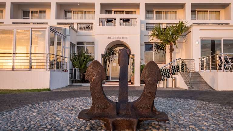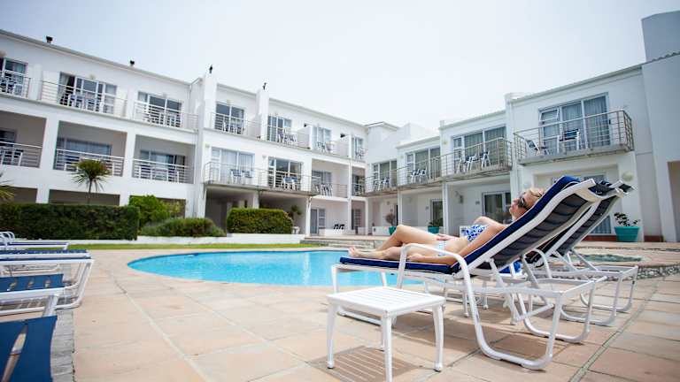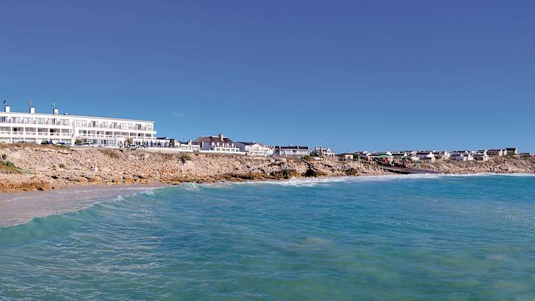 Das Hotel liegt im malerischen Fischerdörfchen Arniston, direkt an der Steilküste, nur 400 Meter vom Sandstrand entfernt. Umgeben von weißen Sandsteinklippen, Dünen und dem türkisfarbenen Indischen Ozean, bietet es Ruhe und Schönheit. In der Nähe befinden sich Sehenswürdigkeiten wie das Schiffswrackmuseum in Bredasdorp und die Waenhuiskrans Höhlen.