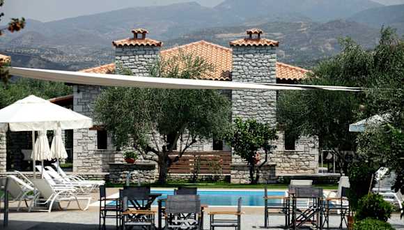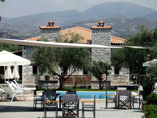 Asfendamos bietet Übernachtungsmöglichkeiten in einem klimatisierten Ferienhaus mit einem Schlafzimmer, einem Wohnzimmer sowie einer komplett ausgestatteten Küche. Zu den Annehmlichkeiten gehören ein saisonaler Außenpool, ein Garten, eine Bar und ein Restaurant. Es stehen kostenloses WLAN und Bergblick zur Verfügung, und die Unterkunft verfügt über kostenlose Privatparkplätze.
