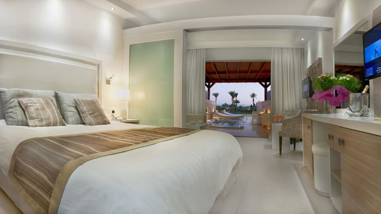 Die Zimmer im Asterias Beach Hotel sind modern gestaltet und bieten unter anderem eine Klimaanlage, einen Safe, einen Flachbildfernseher und kostenloses WLAN. Die meisten Zimmer verfügen über einen Balkon mit Blick auf die Gärten oder das Meer und sind Nichtraucherzimmer.