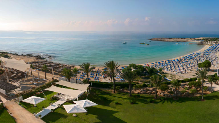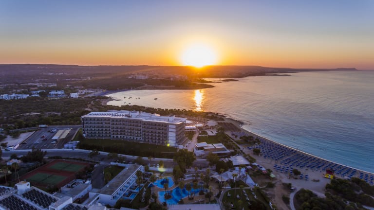 Das Hotel befindet sich in einer ruhigen Bucht direkt am flach abfallenden und feinsandigen Makronissosstrand, der für Kinder gut geeignet ist. Einkaufsmöglichkeiten und Restaurants sind ca. 600 Meter entfernt, während das Stadtzentrum von Ayia Napa etwa 4 km vom Hotel entfernt ist. Die Anfahrt vom Flughafen Larnaca International Airport beträgt rund 45 Minuten (ca. 51 km).