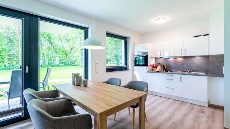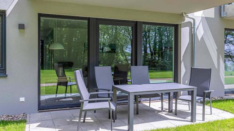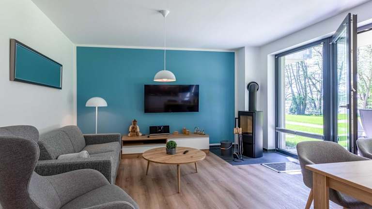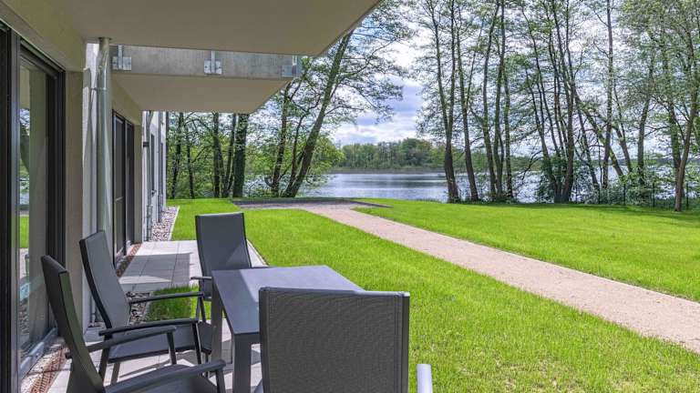 Atempause - Stilvolles Apartment mit Terrasse & Wellness am Krakower See ist eine Ferienwohnung, die modernes Design mit komfortablen Annehmlichkeiten verbindet. Die Unterkunft verfügt über eine Sauna und bietet den Gästen die Möglichkeit, in einem Fitnesscenter aktiv zu bleiben. Die Wohnung hat eine Terrasse mit Ausblick auf den See und einen Garten mit Gartenmöbeln.