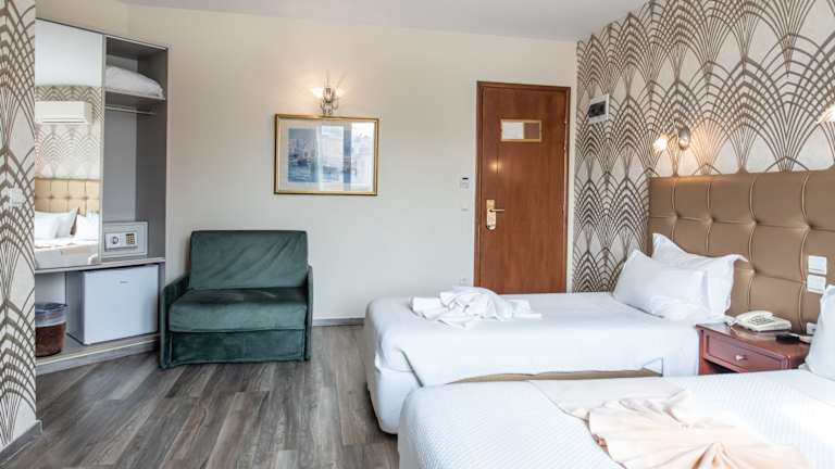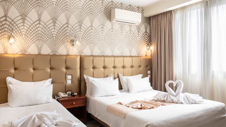 Die Zimmer im Athens Golden City Hotel sind geräumig und klimatisiert. Sie sind in Erdtönen gehalten und verfügen über komfortable Betten, Sat-TV, einen Kühlschrank und ein Bügeleisen/-brett. Jedes Zimmer bietet einen angenehmen Rückzugsort nach einem erlebnisreichen Tag in Athen.