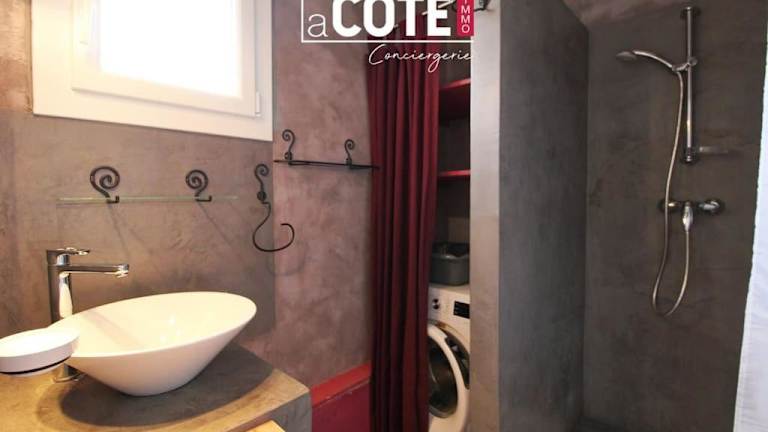 Die Ferienwohnung verfügt über ein Schlafzimmer, eine Küche mit Kühlschrank und ein Badezimmer, das mit einer Dusche und einer Waschmaschine ausgestattet ist.