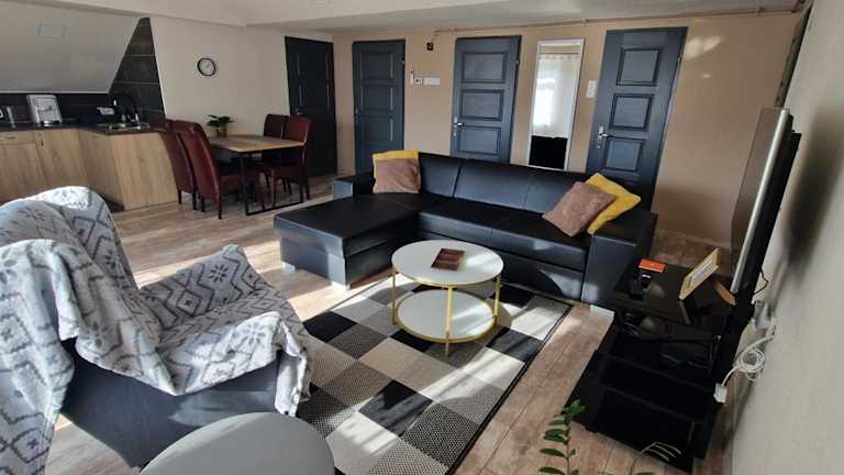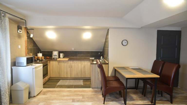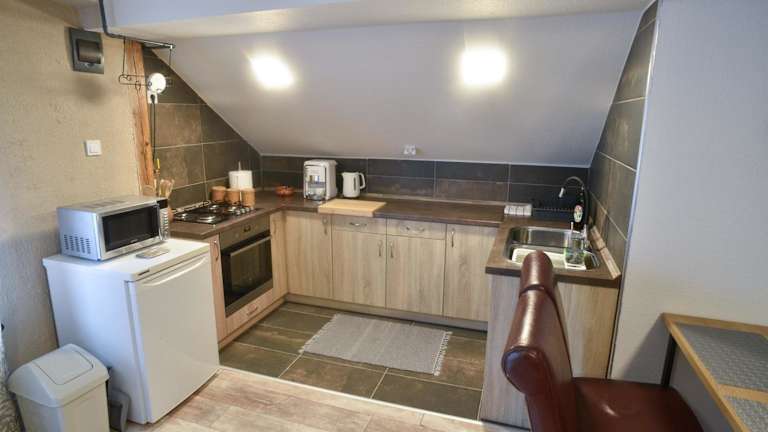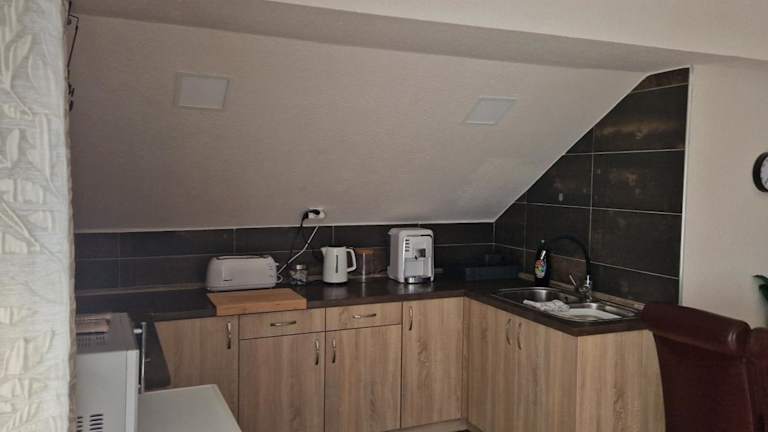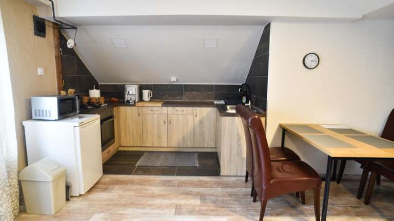 Die Ferienwohnung umfasst zwei Schlafzimmer, ein Wohnzimmer sowie eine voll ausgestattete Küche, die mit einem Kühlschrank und einer Kaffeemaschine versehen ist. Des Weiteren gibt es ein Badezimmer mit einer Dusche. Handtücher und Bettwäsche werden bereitgestellt.