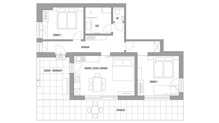 Die Ferienwohnung verfügt über zwei Schlafzimmer, ein Wohnzimmer und eine gut ausgestattete Küche mit Kühlschrank und Geschirrspüler. Außerdem ist ein Badezimmer mit Dusche vorhanden. Zur Ausstattung gehören ebenfalls ein Flachbild-TV sowie Handtücher und Bettwäsche.