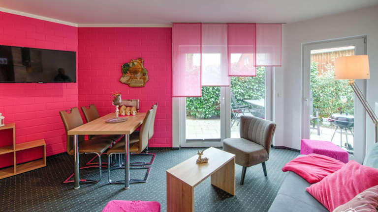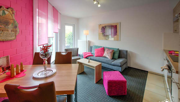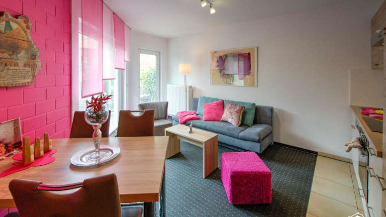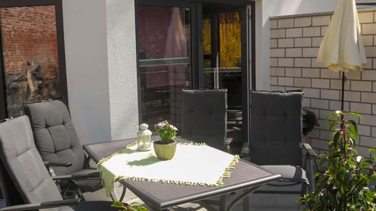 Die Ferienwohnung verfügt über eine Terrasse, ein Schlafzimmer, ein Wohnzimmer sowie eine gut ausgestattete Küche mit Kühlschrank und Geschirrspüler. Handtücher und Bettwäsche werden bereitgestellt.