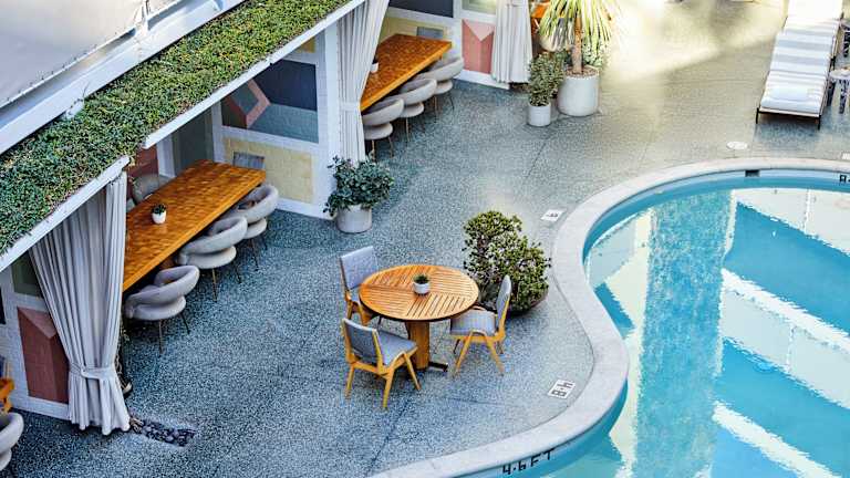 Im eleganten Restaurant Viviane, das sich am Bumerang-förmigen Pool des Hotels befindet, können Sie köstliche kalifornische Interpretationen der europäischen und amerikanischen Küche genießen. Das Restaurant ist mit Originalmöbeln aus den 1950er und 1960er Jahren eingerichtet und bietet sowohl Innen- als auch Außenbereiche zum Speisen. Die Weinkarte ist auf die Speisekarte abgestimmt und bietet eine Auswahl an auserlesenen Boutiqueweinen. Genießen Sie auch saisonale Cocktails, die von den 1950er Jahren inspiriert sind.