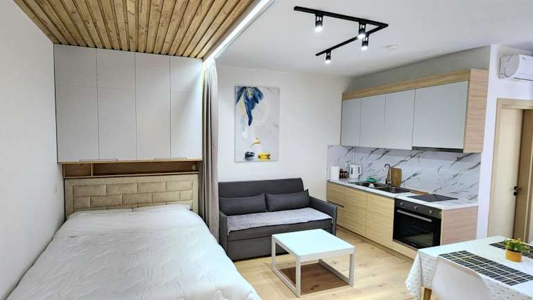 Das Apartment verfügt über ein Schlafzimmer, ein Wohnzimmer und ein Badezimmer. Es bietet Platz für bis zu zwei Personen und ist ideal für Paare oder Alleinreisende. Mit einem Balkon und Meerblick können Sie die herrliche Aussicht auf das Meer und die umliegenden Berge genießen. Das Apartment ist mit einer Klimaanlage ausgestattet, um Ihnen auch an heißen Tagen angenehme Temperaturen zu bieten. Kostenloses WLAN ist ebenfalls vorhanden, sodass Sie problemlos mit Ihren Lieben in Kontakt bleiben können. Handtücher und Bettwäsche werden gestellt, um Ihnen einen komfortablen Aufenthalt zu ermöglichen.
