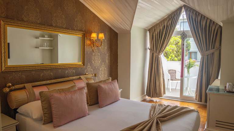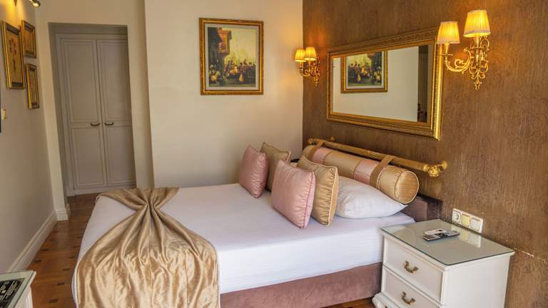 Standardzimmer Komfortable Zimmer, die modernen osmanischen Stil mit Parkettboden, Seidengardinen und geschmackvoller Einrichtung vereinen. Jedes Zimmer verfügt über Klimaanlage, LCD-TV, Minibar (gegen Aufpreis), kostenloses WLAN, digitalen Safe sowie kostenlosen Tee- und Kaffeezubereitungen. Elegance-Zimmer Geräumige Zimmer mit einer stilvollen Mischung aus östlichen und westlichen Elementen des osmanischen Designs, teilweise mit privatem Balkon. Einige Zimmer bieten einen atemberaubenden Blick auf die Blaue Moschee, das Marmarameer oder den Stadtteil Sultanahmet. Alle Elegance-Zimmer sind mit Klimaanlage, LCD-TV, Minibar (gegen Aufpreis), kostenlosem WLAN, digitalem Safe sowie kostenfreien Tee- und Kaffeezubereitungen ausgestattet.