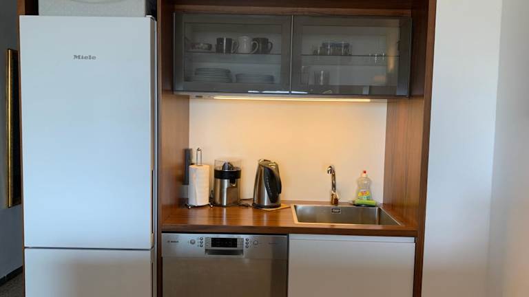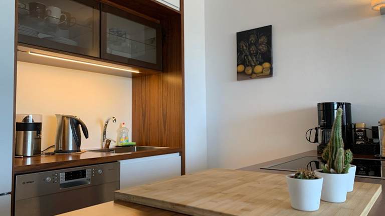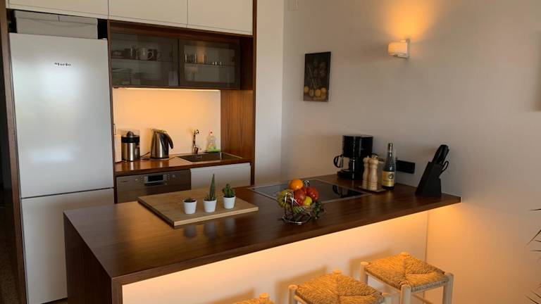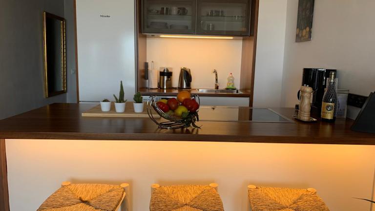 Die Unterkunft umfasst eine Bar, und die Küchenzeile ist mit einem Kühlschrank, einem Geschirrspüler, einem Ofen sowie einer Kaffeemaschine und einem Wasserkocher ausgestattet. Es gibt keine weiteren Informationen zu Verpflegungsmöglichkeiten.