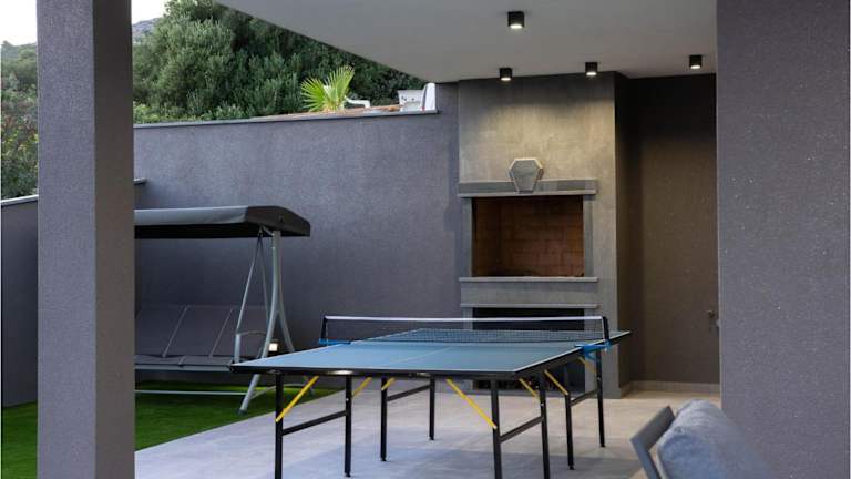 Das Ferienhaus verfügt über fünf Schlafzimmer, die eine komfortable Unterkunft für große Gruppen oder Familien bieten. Die klimatisierten Zimmer sind gemütlich eingerichtet und bieten einen angenehmen Rückzugsort nach einem Tag voller Aktivitäten. Die gut ausgestattete Küche bietet alles, was Sie für die Zubereitung Ihrer Mahlzeiten benötigen, und das Wohnzimmer lädt zum Entspannen ein. Auf der Terrasse können Sie die frische Luft genießen und den Blick auf die Umgebung genießen.