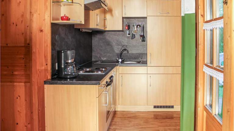 Die voll ausgestattete Küche ist mit einem Kühlschrank und einer Kaffeemaschine ausgestattet, sodass die Zubereitung eigener Mahlzeiten möglich ist.