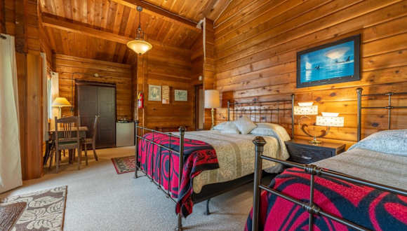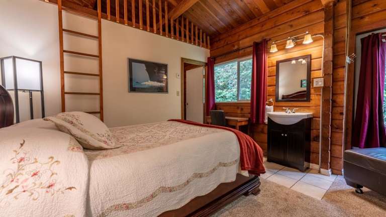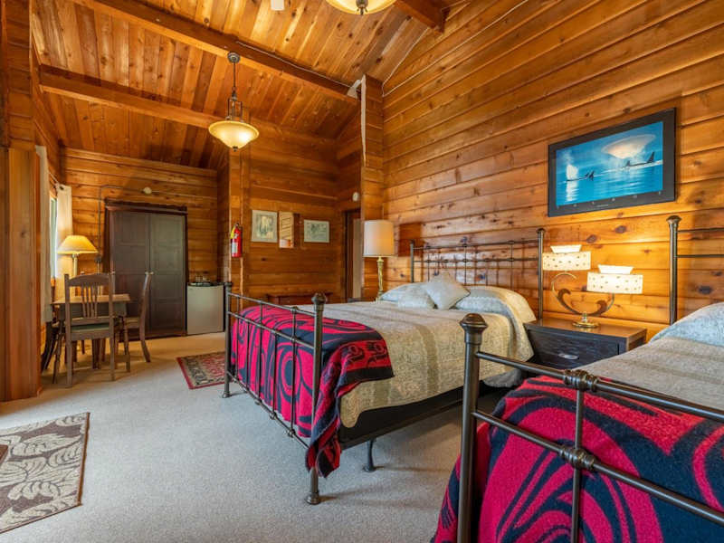 Die Zimmer in der Alert Bay Lodge sind im rustikalen Blockhausstil gestaltet und bieten entweder einen Blick auf den Garten oder das Meer. Jedes Zimmer verfügt über ein eigenes Bad und kostenfreies WLAN. Genießen Sie den Komfort und die Gemütlichkeit dieser Unterkunft.