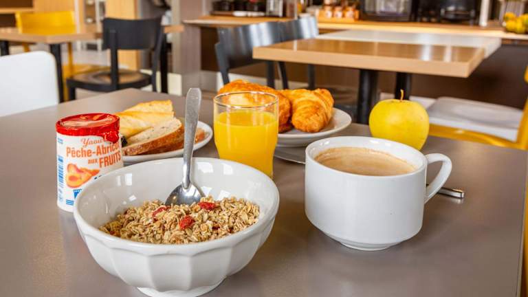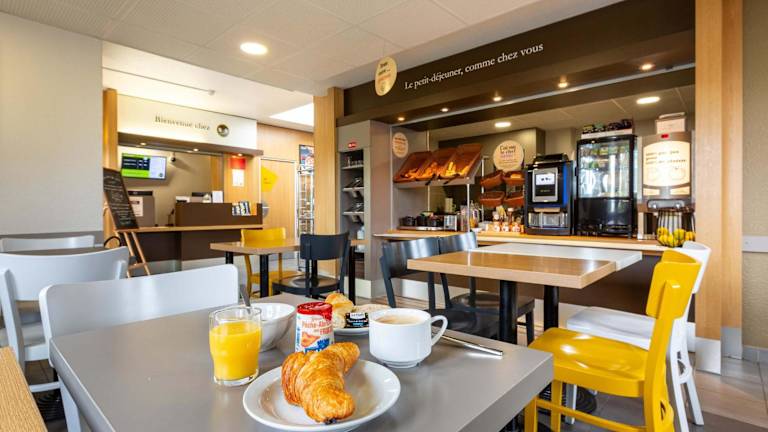 Ein Frühstück wird in Form eines Buffets in der Unterkunft angeboten. Desweiteren gibt es eine Snackbar sowie Automaten für Getränke und Snacks.
