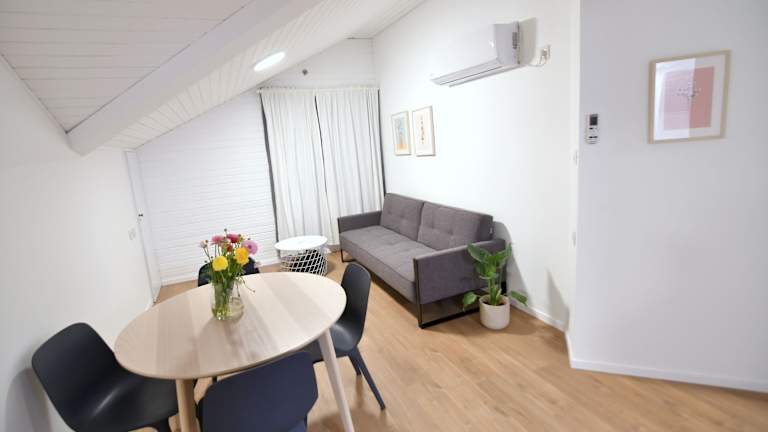 Die Wohneinheiten sind mit Parkettböden ausgestattet und verfügen über eine voll ausgestattete Küchenzeile mit Kühlschrank, Mikrowelle, Kaffeemaschine und Wasserkocher. Jedes Zimmer bietet einen Essbereich, einen Flachbild-TV mit Kabelkanälen sowie ein eigenes Badezimmer mit Dusche und Haartrockner.