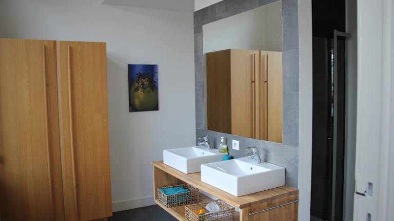 Das Zimmer im B&B Le Verger ist modern und komfortabel eingerichtet und bietet einen schönen Gartenblick. Die großen Fenster lassen viel Tageslicht herein und schaffen eine angenehme Atmosphäre. Zur Ausstattung gehören ein Flachbild-Kabel-TV und ein modernes privates Badezimmer. Kostenfreies WLAN ist in der gesamten Unterkunft verfügbar.