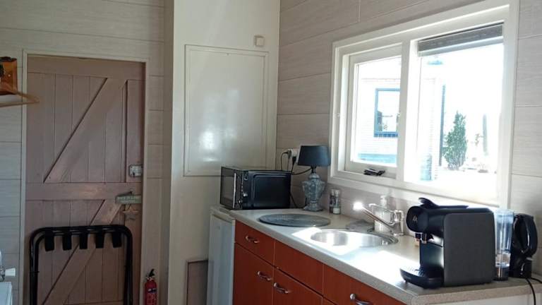 Die Küche in der Unterkunft ist ausgestattet mit einem Kühlschrank, einem Ofen, einer Mikrowelle, einer Kaffeemaschine und einem Wasserkocher.