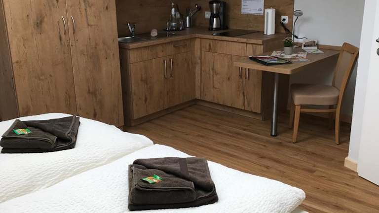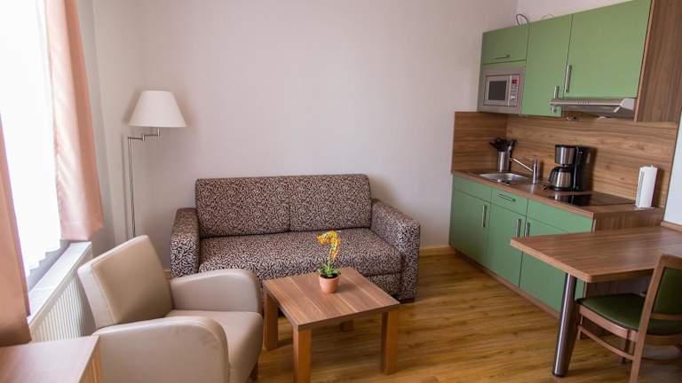 Die Apartments im Bahnhofsquartier Bad Wilsnack sind hell und modern eingerichtet. Jedes Apartment verfügt über eine voll ausgestattete Küche mit Kochfeld und Essbereich, einen gemütlichen Sitzbereich und ein eigenes Badezimmer mit Dusche.