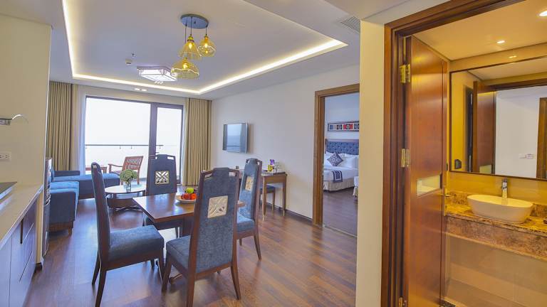 Die Zimmer sind klimatisiert und verfügen über einen Balkon oder eine Terrasse mit Meerblick. Die Ausstattung umfasst ein Doppelbett oder Kingsize-Bett, eine Minibar, einen Safe, einen Schreibtisch, eine Tee-/Kaffeemaschine und einen Fernseher. Die Badezimmer sind mit einer Dusche, Haartrockner und Bademänteln ausgestattet. Einige Zimmer bieten einen Stadtblick.